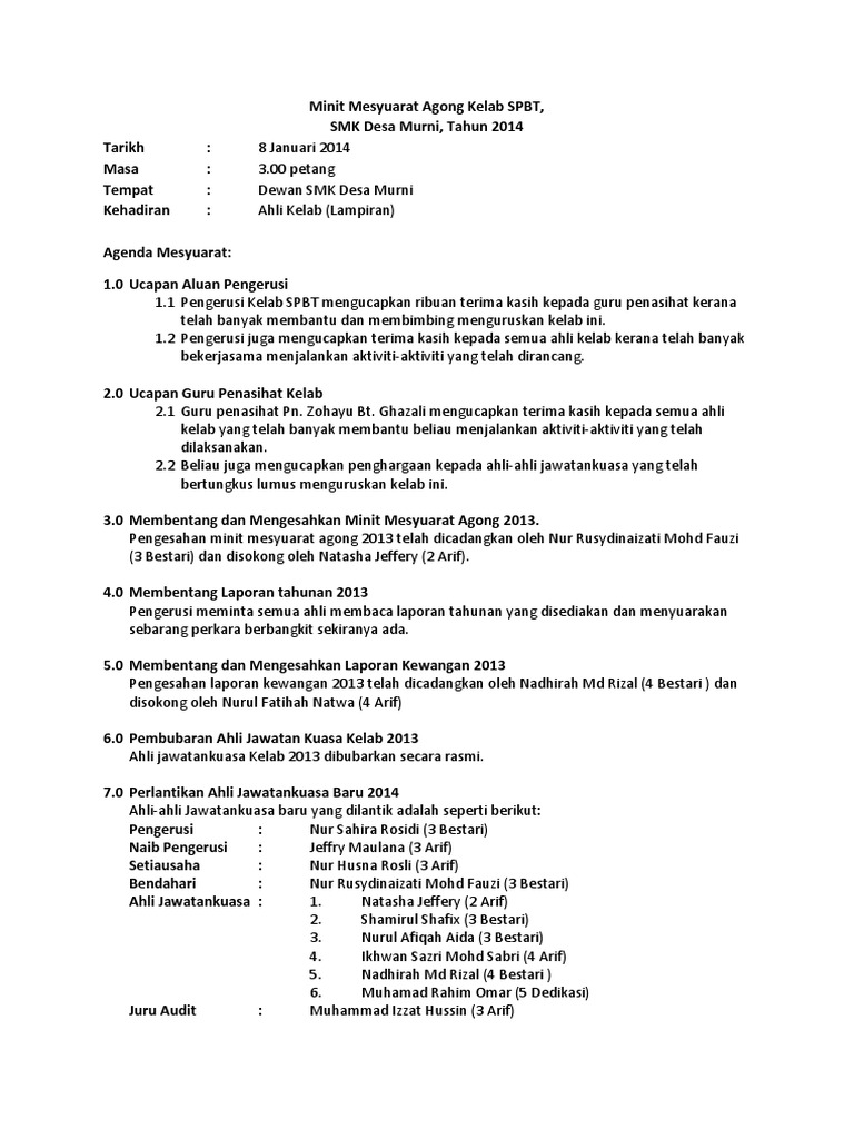 Minit Mesyuarat Agung Kelab Pembimbing Rakan Sebaya Cute766 from i0.wp.com Menjayakan mesyuarat agung persatuan belia. Pemilihan ajk baru telah diadakan. Minit dalam menit menyediakan kemampuan penyuntingan komprehensif untuk minit mesyuarat, item agenda, senarai tugas, kehadiran, dan peringatan. 4.1puan nazril hasina meminta agar semua ahli kelab dapat memberi komitmen dan kerjasama setiap kali perjumpaan dan aktiviti kelab. Membentang dan mengesahkan minit mesyuarat lalu. Kelas 3 berani ,smk kelana jaya kehadiran : Pengurusan mesyuarat & penulisan minit mesyuarat. Contoh surat notis mesyuarat agungkelab kembara dan rekreasi,ruj.