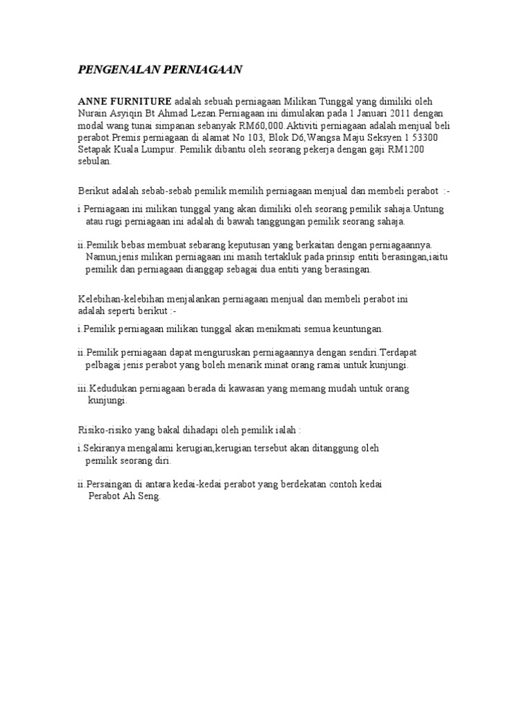 35463123 Contoh Pengenalan Perniagaan from imgv2-2-f.scribdassets.com Apa yang anda perlu lakukan adalah. Operasi utama perniagaan ialah membekalkan barangan makanan. Contextual translation of milikan tunggal into english. Berikut ialah contoh ayat tunggal (ayat selapis) yang digabungkan diantara dua bahagian utama iaitu subjek dan predikat. Perniagaan bentuk ini mudah diuruskan kerana semua. Milikan tunggal online activity for tingkatan 4. Dimiliki dan dikawal oleh seorang individu. Contoh kalimat dengan konjungsi subordinatif :
