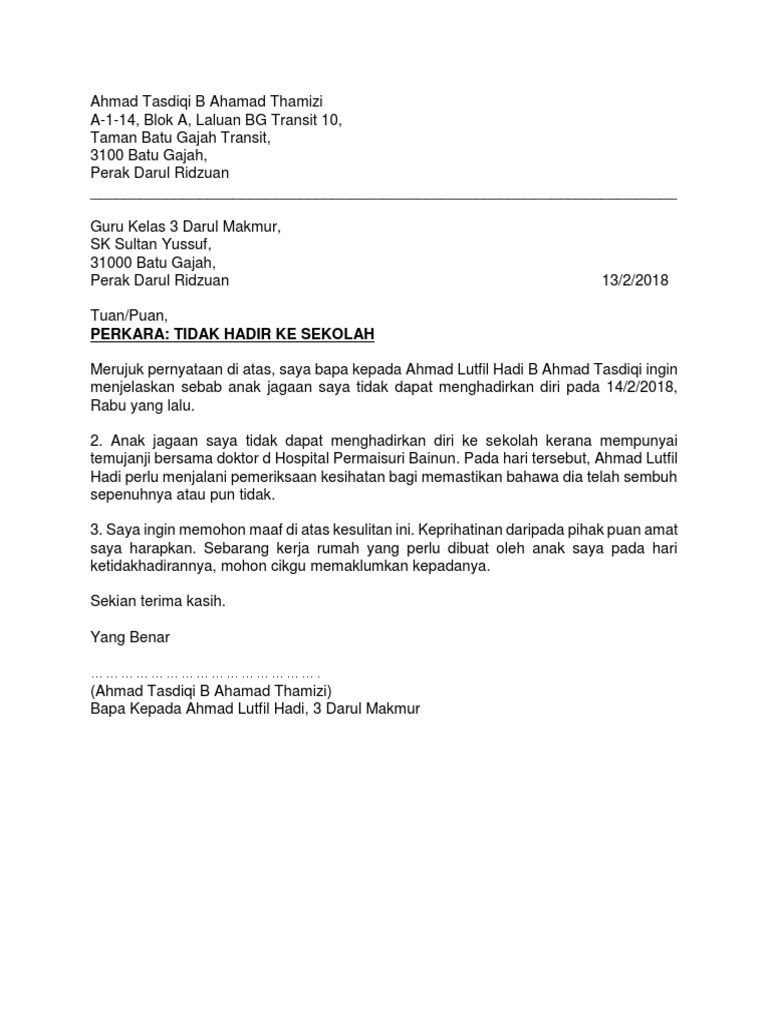 Surat Tidak Hadir Ke Sekolah Lutfi 14.2.2018 - Temujanji ... from imgv2-1-f.scribdassets.com Ahmad bin muhammad 112 jalan malaka kampung, taman ramai sentosa, 80000 pontian. Biasanya, seseorang izin tidak masuk karena suatu keperluan yang tidak bisa dihindarkan, seperti sakit, keperluan keluarga, dan kegiatan lainnya. Berikut dikongsikan senarai contoh surat rasmi tidak hadir ke sekolah buat panduan semua. Contoh surat izin sakit ini bisa kamu gunakan untuk keperluan tidak masuk sekolah, kuliah, atau pun kerja. Di bawah ini saya sajikan contoh surat izin tidak masuk sekolah. Sekiranya anak tidak dapat hadir kesekolah, ibubapa hendaklah menghantar surat rasmi tidak hadir ke sekolah atau surat tunjuk sebab sebagai bukti kepada guru kelas dan. Contoh contoh surat cuti sekolah yang dikongsikan di bawah ini boleh digunakan samada anda ada atau tiada sijil sakit daripada doktor klinik atau doktor hospital. 9 contoh / cara tulis surat tidak hadir ke sekolah.