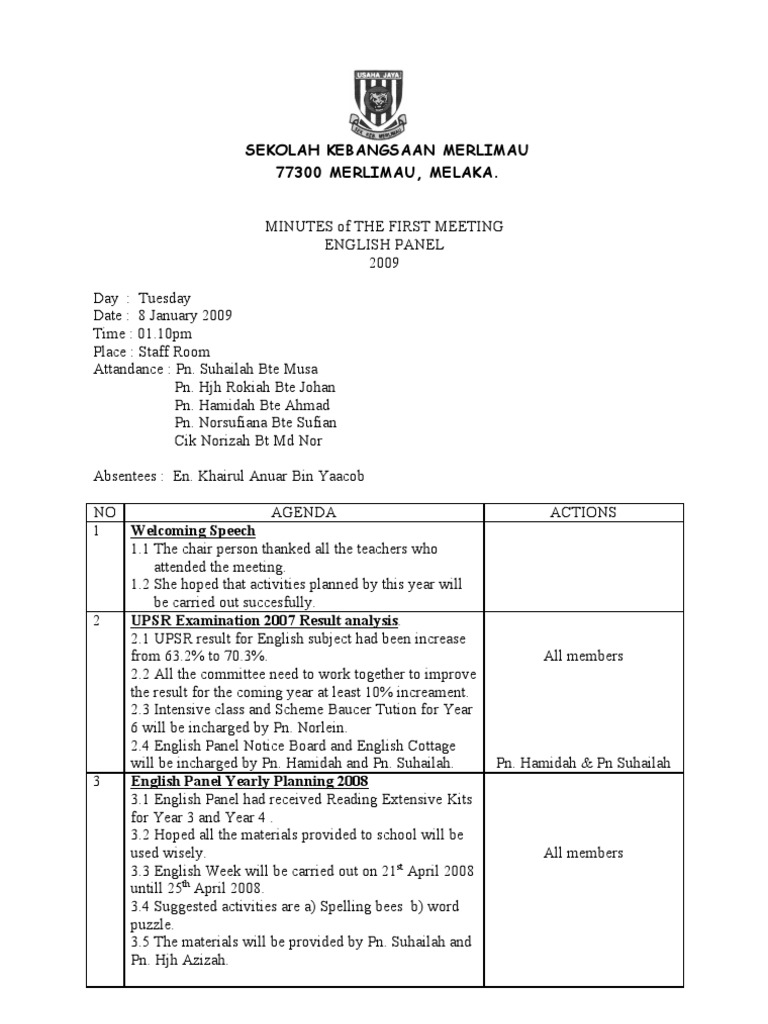 10:03:00 kokurikulum minit mesyuarat pengurusan kokurikulum penulisan minit mesyuarat. Technical committee on metals and ores. Ini kerana ia akan menjadi panduan dan rujukan buat pekerja dan orang yang hadir atau tidak untuk mengetahui hasil keputusan sesuatu mesyuarat. Nurul izzaty binti hassan penyelia dr. Minit dalam menit menyediakan kemampuan menyunting komprehensif untuk minit mesyuarat, item agenda, senarai tugasan, kehadiran dan peringatan.