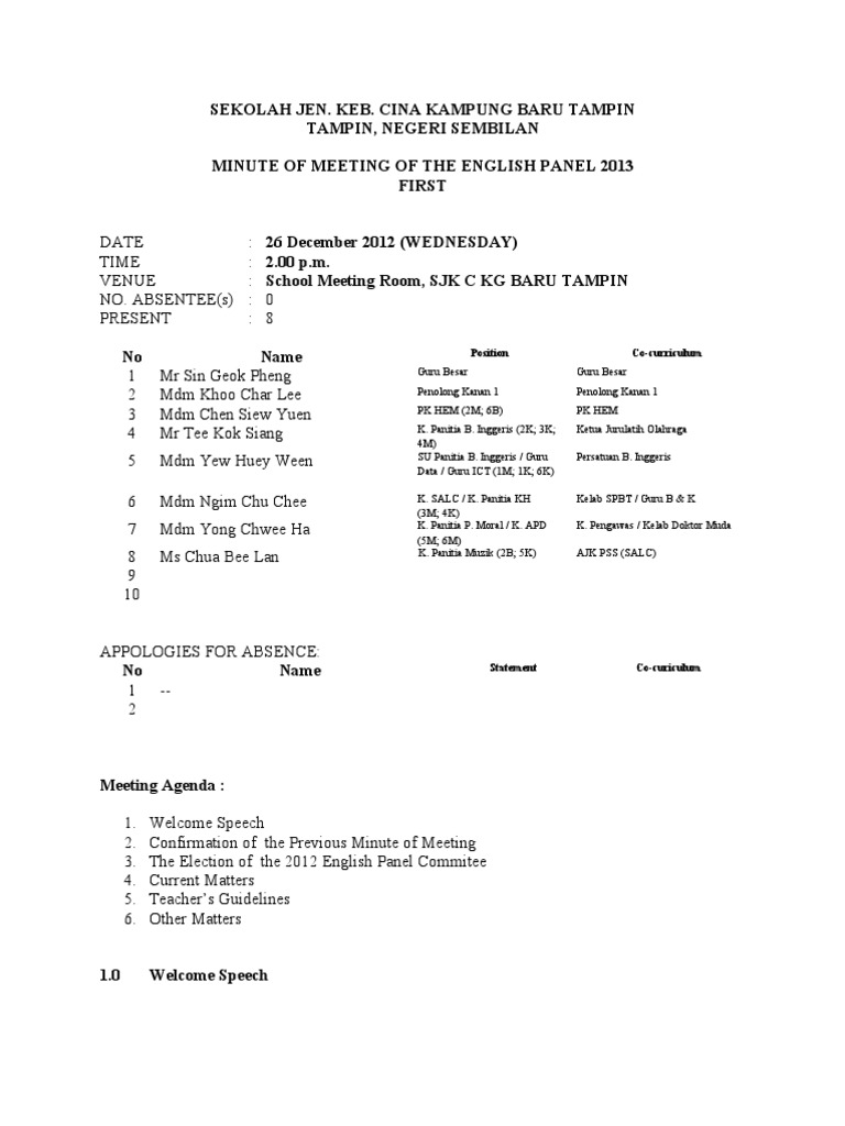 Minit Mesyuarat In English from imgv2-2-f.scribdassets.com Another word for opposite of meaning of rhymes with sentences with find word forms translate from english translate to english words with friends scrabble crossword / codeword words starting with words ending with words containing exactly. Didalam sistem pendidikan di sekolah, terdapat pelbagai jenis mesyuarat yang bakal diadakan. Nurul izzaty binti hassan penyelia dr. Paper memudahkan tugas mengambil nota mesyuarat, memberikan tugasan, membina idea kreatif dan menguruskan projek. Minit mungkin dibuat ketika mesyuarat itu berlangsung oleh seorang jurutaip atau wartawan mahkamah, yang boleh menggunakan notasi trengkas (shorthand) dan kemudian. Savesave minit mesyuarat english bil.1 for later. Format minit mesyuarat yang betul pendidik2u sekolah minit mesyuarat kedua bi 2018 english panel meeting 3 2018 docx sjk t ladang regent 73200 gemencheh negeri sembilan darul khusus tel 06 4316643 fax 06 kod sekolah nbd 5031 course hero. Contoh minit mesyuarat penubuhan sekolah untuk urusan penubuhan dan pendaftaran sekolah agama islam di negeri selangor.