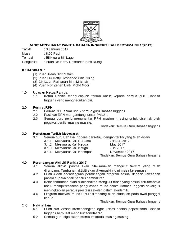 Minit Mesyuarat Panitia Bahasa Inggeris Kali Pertama Bil1 Docx from imgv2-2-f.scribdassets.com Jika tiada catatan, segala perbincangan tidak akan ada tindakan susulan. Pengesahan minit mesyuarat minit mesyuarat telah disahkan oleh pengarah semua ahli mesyuarat asyraf nasuha bin jamsari 3.0 perkara perbincangan 3.1 laporan dan tindakan ahli mesyuarat hadir dr. First of all, the english head panel, pn hajar abd aziz welcomed en. Public admin (dpa) (pad 270). Financial accounting and reporting (far270). Dalam sistem pendidikan di sekolah, terlalu pelbagai mesyuarat yang bakal diadakan. Nurul izzaty binti hassan penyelia dr. Format minit mesyuarat yang betul pendidik2u sekolah minit mesyuarat kedua bi 2018 english panel meeting 3 2018 docx sjk t ladang regent 73200 gemencheh negeri sembilan darul khusus tel 06 4316643 fax 06 kod sekolah nbd 5031 course hero.