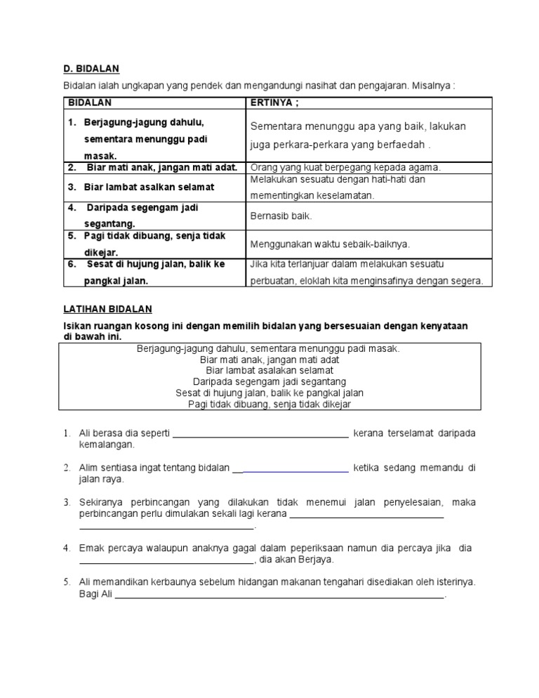 Seperti biasa, hari itu aku pulang dari kantor tepat jam 5 sore. Buaya, masuk ke mulut harimau. Koleksi bidalan adat periuk berkerak, adat lesung berdedak jika ingin hidup mewah, mestilah berusaha alur bertempuh, jalan berturut melakukan sesuatu hendaklah menurut kebiasaan yang lazim batu yang. Untung sabut timbul, untung batu tenggelam. Sesat di hujung jalan, balik ke pangkal jalan.
