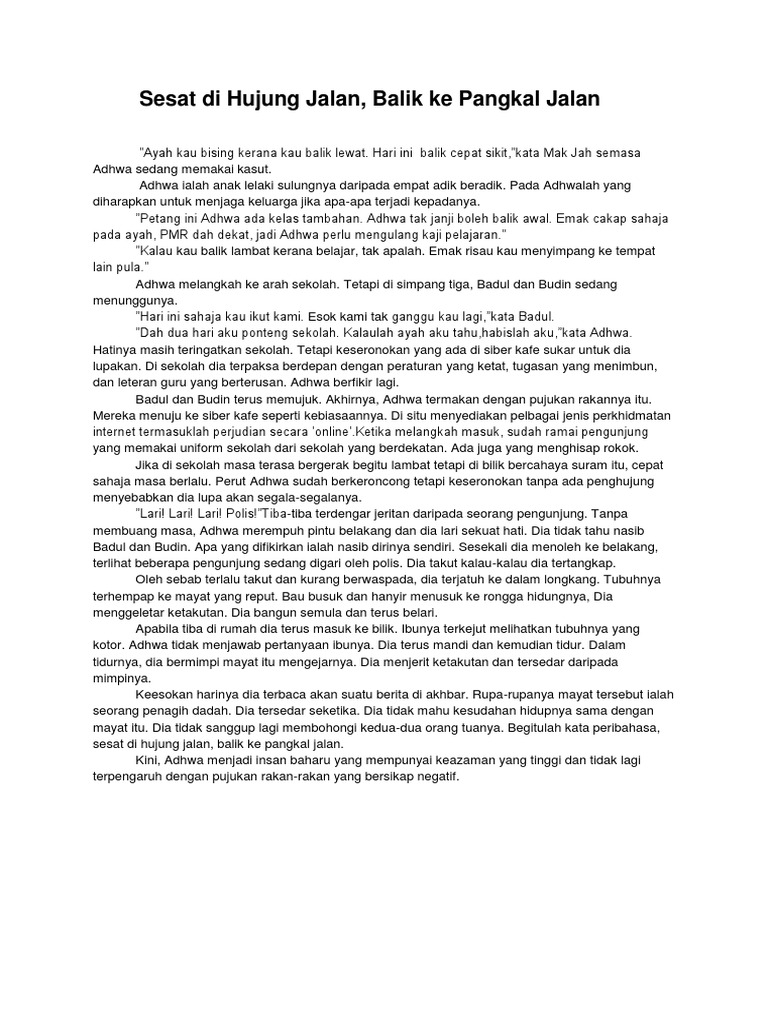Jikalau beranak, ikut kata bidan. Maksud lapis pertama jelas dan maksud lapis kedua merujuk orang yangs edikit ilmu dan pengalaman sesat di hujung jalan, balik ke pangkal jalan. Sedar dan insaf setelah melakukan kesilapan agar tidak terpesong jauh. Biar la anak ini penat. Jikalau beranak, ikut kata bidan. Sesat di hujung jalan, balik ke pangkal jalan. Balik lah.hari dah senja, nanti pintu rumah dah di tutup tak boleh masuk dah. Jalan balik surau | telefilem. Apabila perundingan menemui jalan buntu, haruslah segera balik ke punca masalah. Sesat di hujung jalan, kembali ke pangkal jalan. Jalan sampai mengeheret beg, berjalan menggunakan lutut.tapi yang. Seperti biasa, hari itu aku pulang dari kantor tepat jam 5 sore. Tak puas hanya di kursi ruang tamu istri ku kali ini pun mulai berani mengajak aku dan lelaki itu untuk kembali ke kamar.